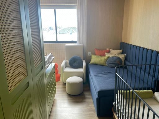 Apartamento com 109m², 2 quartos sendo os 2 suítes, 1 lavabo, 1 depêndencia de empregada(o), Sala de estar e jantar integradas, com design contemporâneo Varanda gourmet com churrasqueira, Cozinha planejada, Área de serviço, dependência completa, 2 vagas de garagem.
