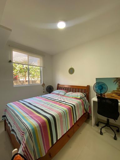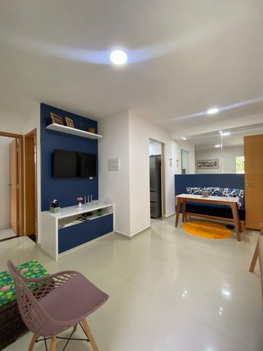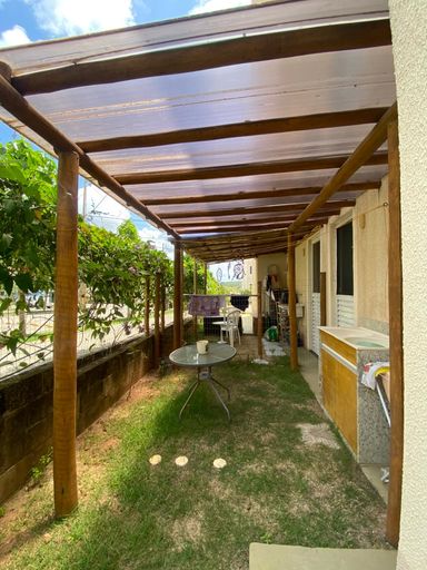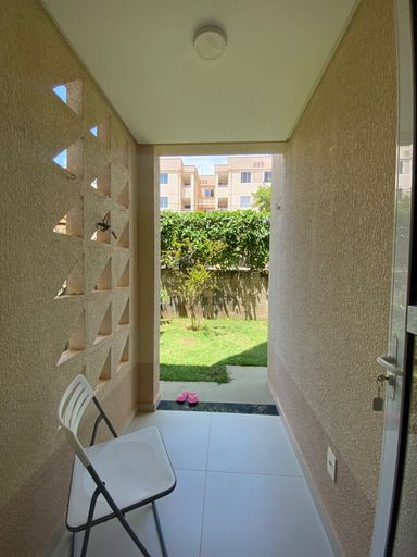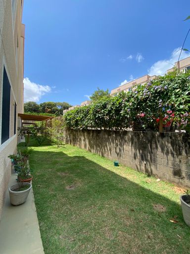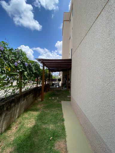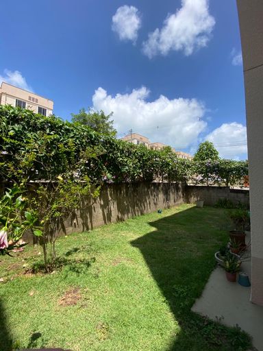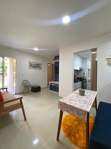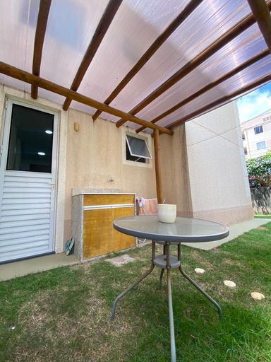 Apartamento mobiliado, 2 quartos, 1 banheiro social, sala para dois ambientes, cozinha com bancada em granito, área de serviço, varanda com plantas em formato de L, quintal amplo.