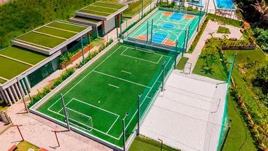 Na área de lazer, você terá um complexo aquático e esportivo completo. Quadras de vôlei, poliesportiva, campo society, piscinas adulto e infantil, academia equipada, salão de jogos, salão de festas, vários espaços gourmets e muito espaço verde para sua família se conectar mais com a natureza e ter todo o conforto de um lar moderno.