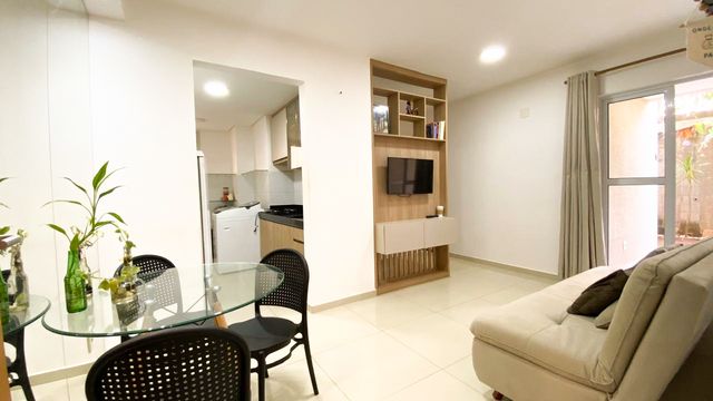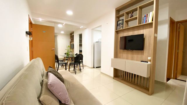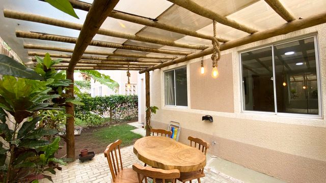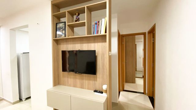 Apartamento com 2 quartos, equipado com armários planejado, sala para dois ambientes com móveis planejados, cozinha com bancada em granito, área de serviço externo, varanda com plantas em formato de L com caramanchão e chuveirão na área externa, banheiro com box e armário.