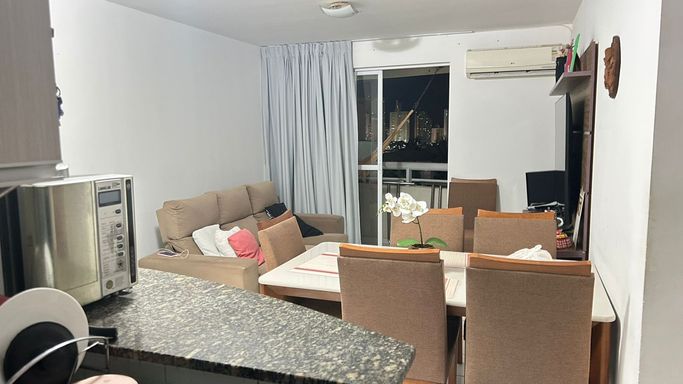 02 quartos com móveis planejados sendo 1 suíte, sala para 2 ambientes, cozinha americana com planejados, varanda, 1 banheiro social com armário e box, 59,63 m² de área privativa.
