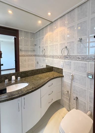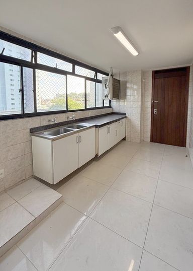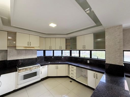 1 por andar, de 264m², salas para 3 ambientes, 4 suítes amplas, sendo 1 suíte master com closet, sala de TV entre os quartos, cozinha espaçosa, área de serviço e dependência completa, 3 vagas de garagem.