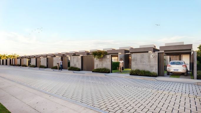 Casa térrea com sala de estar e jantar integrada, varanda, 02 quartos sendo uma suíte, wc social, cozinha americana, área de serviço, 01 vaga de garagem, 60 m² de área construída em terrenos de 150 m².