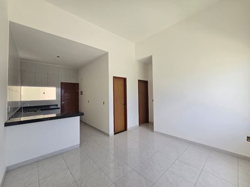 Casa térrea dividida entre os ambientes: sala de estar e jantar, cozinha , circulação, 02 Quartos sendo 1 semi suite, área de serviço, garagem.
