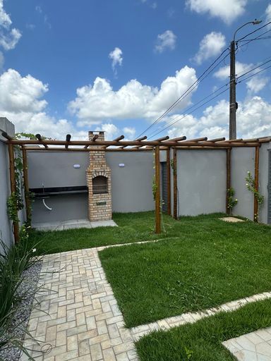 O condominio tem uma área com caramanchão, churrasqueira e pia de apoio.