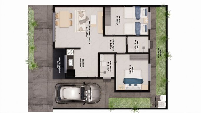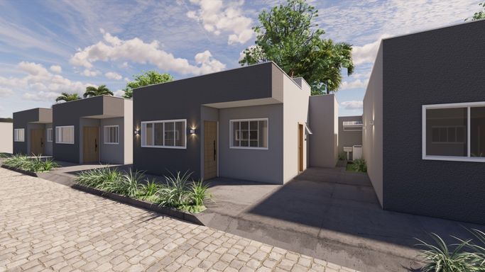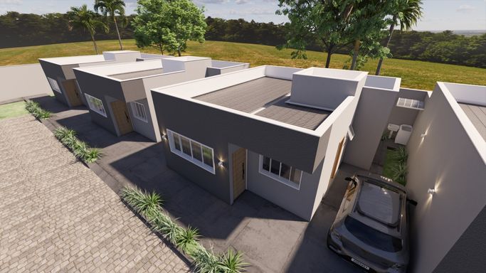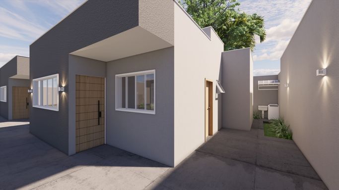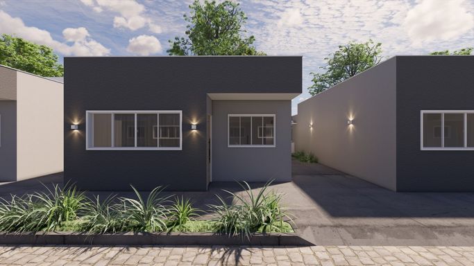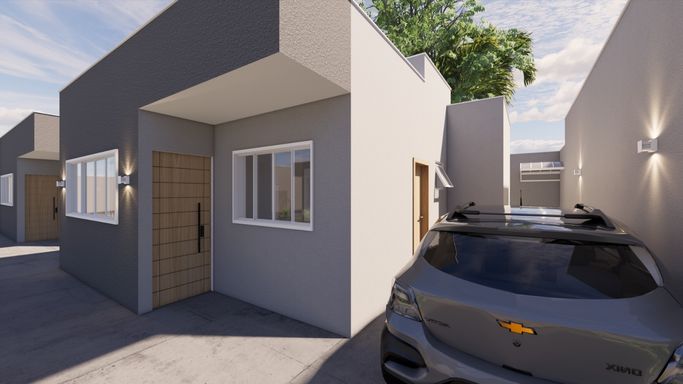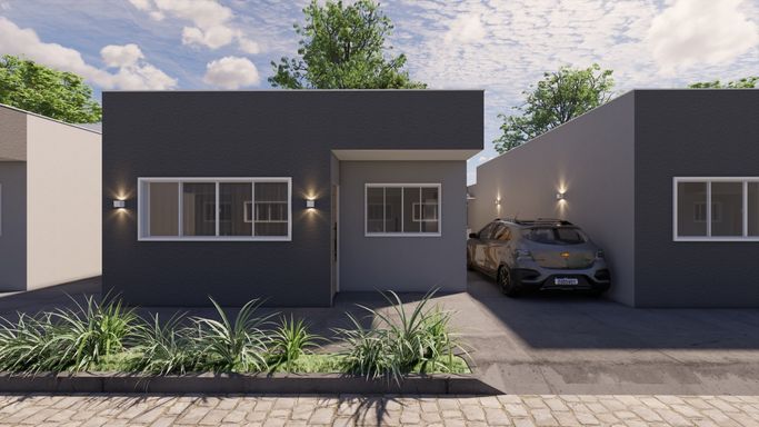 Sala de esta e jantar integrada a cozinha, 02 quartos sendo uma suíte, área de serviço, 01 vaga de garagem, quintal pequeno, lajeada.