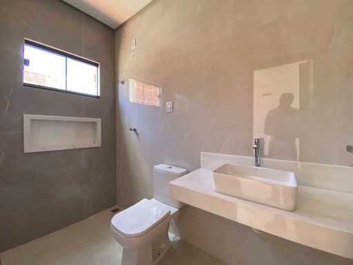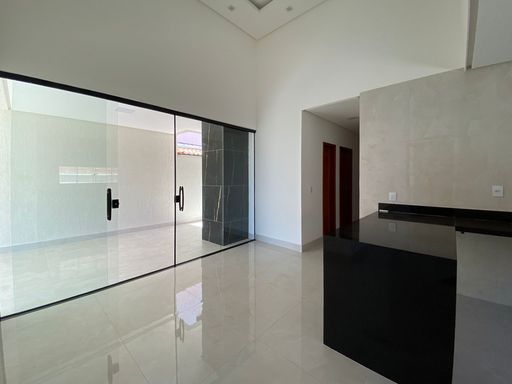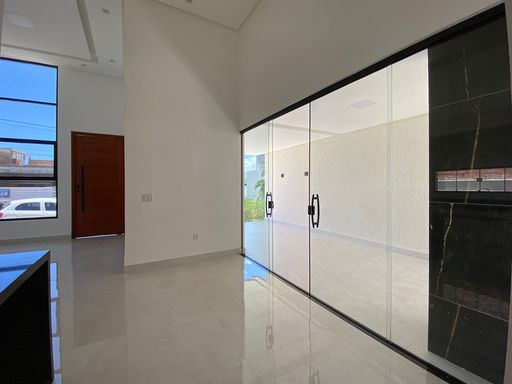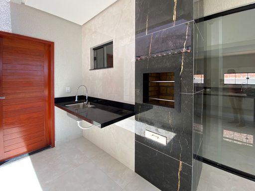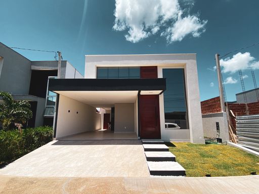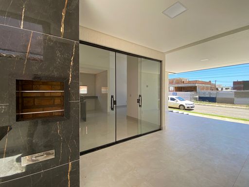 Casa com 122m² de área construída em um terreno de 200m², pele de vidro na fachada, 3 quartos, sendo 2 suítes e 1 suíte master com closet, Cozinha com cooktop integrada, Área gourmet com churrasqueira, 2 vagas de garagem.