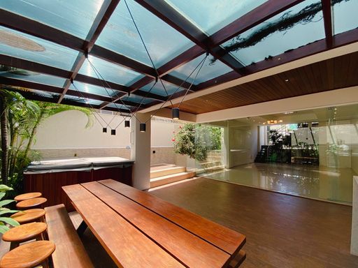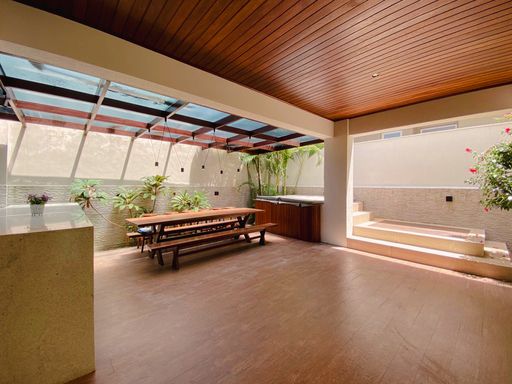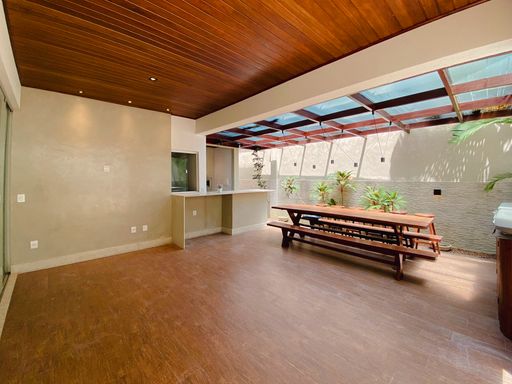 Sala para 2 ambientes, Quarto com hidro, Lavabo na sala, Cozinha independente, Lavabo na área gourmet, Depósito, Despensa, Área de serviço, Espaço gourmet com SPA Externo, Ducha externa, 03 vagas de garagem cobertas, Churrasqueira á gás, máquina de lavar louça, cooktop, bancadas, armários e pia, Lado da sombra.