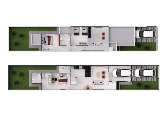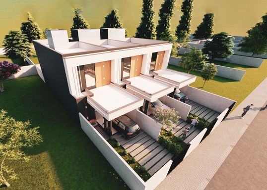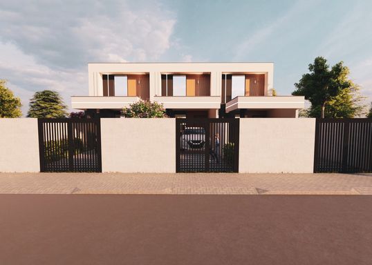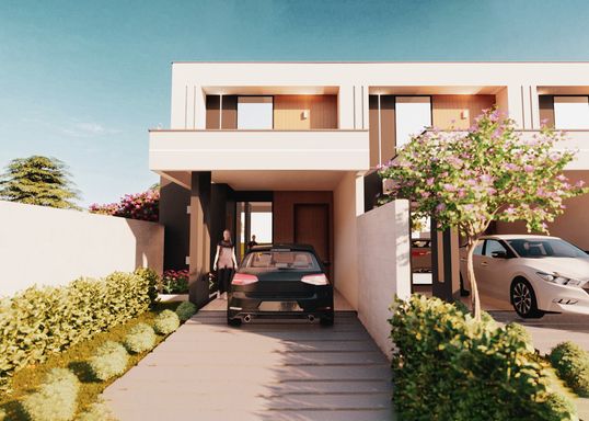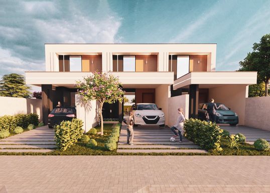 sala para 2 ambientes com pé direito duplo, lavabo, 1 suíte com closet, cozinha com despensa, área de serviço, varanda frontal e 2 vagas de garagem.