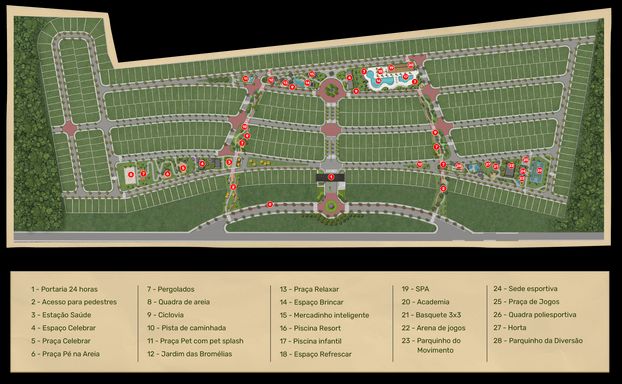 O condomínio conta com 512 lotes, com metragens a partir de 150m², e disponibiliza 28 opções de lazer diferenciadas, que transformam o dia a dia em uma verdadeira experiência de resort.