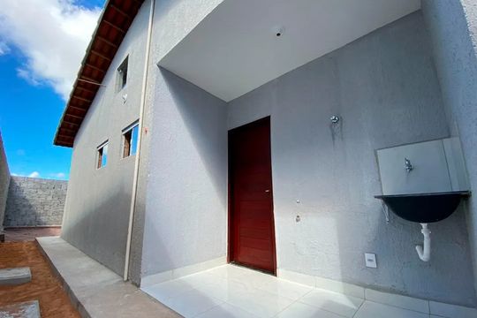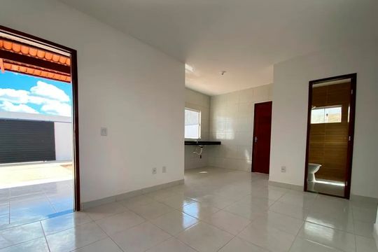 Casa nova térrea dividida entre os ambientes: sala, 02 quartos sendo 01 suíte, banheiro social, cozinha americana, área de serviço, 02 Vagas de Garagem, quintal amplo.