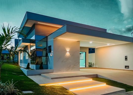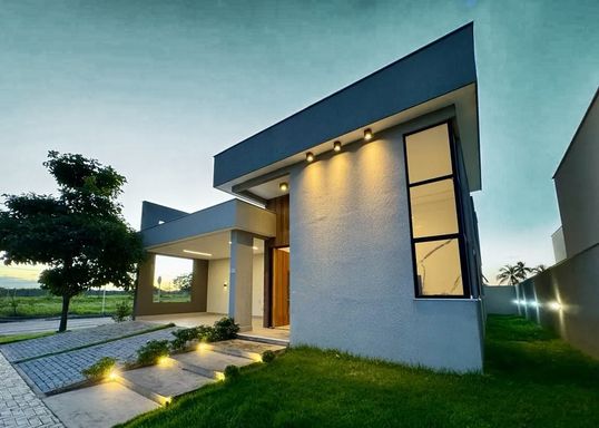 Casa térrea com 120m² de área construída, 03 Quartos, 02 suítes, 01 semi suíte, 01 wc social, Sala com pé direito alto, cozinha, Área Gourmet com Churrasqueira.