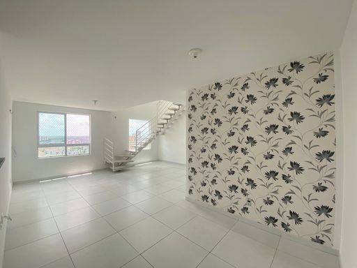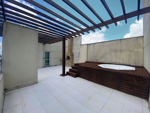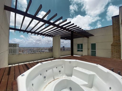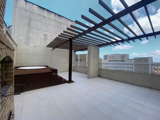 Apartamento na cobertura, duplex, com 171m², 3 quartos, sendo 2 suítes, Sala para dois ambientes (estar e jantar), Banheiro social, Cozinha funcional, Área de serviço, 2 vagas de garagem, e uma excelente área gourmet com churrasqueira, jacuzzi e vista livre para a Maria Lacerda.